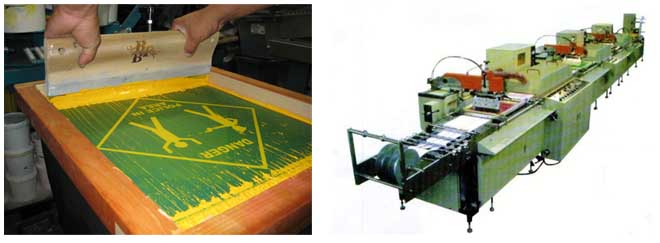 Screen printing - A fine gauze is stretched tightly over a metal frame, and the design to be reproduced is transferred to the gauze. The pores in the gauze is partially blocked off allowing the dye stuff to be squeezed through the gauze where the design is to be printed
